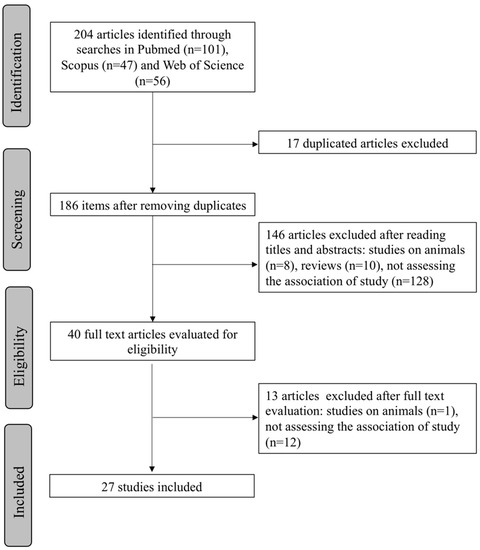 Based on the search carried out, a total of 204 articles (101 Pubmed, 47 Scopus, 56 Web of Science) were obtained using the strategy previously described. From the initial search results, 17 duplicate articles were discarded. After screening of the titles and abstracts of the remaining studies, 146 articles not meeting the eligibility criteria (8 studies carried out on animals, 10 reviews, 128 studies not assessing the association of our study) were excluded. From the 40 articles that were read in their entirety, 13 did not meet the selection criteria (1 study carried out on animals, 12 studies not assessing the association of our study) and were also discarded. Finally, 27 articles were included in this systematic review. A flow chart illustrating the selection process is presented in Figure 1.