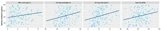 Regarding anthropometry, significant correlation was found between melatonin after 1 h of sleep and the BMI z-score (rho = 0.233, p = 0.005), fat mass percentage (rho = 0.294, p < 0.001) and fat mass index (rho = 0.333, p < 0.001). Melatonin concentration at this time point was also significantly correlated with heart rate (rho = 0.288, p < 0.001) (Figure 2).