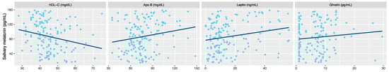 With respect to the metabolic parameters tested, the melatonin concentration after +1 h of sleep only showed an inverse correlation with high-density lipoprotein cholesterol (rho = −0.276, p < 0.001). Other parameters related to metabolic risk, such as apolipoprotein B (rho = 0.202, p = 0.015), leptin (rho = 0.181, p = 0.030) and ghrelin (rho = 0.209, p = 0.012) were positively related (Figure 3). Glucose, insulin, aminotransferases and γ-glutamyl transpeptidase were not found to be significantly associated with the nocturnal melatonin level.