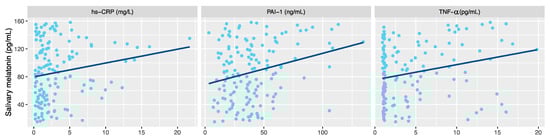 When we focused on the relationship between melatonin and inflammatory markers, significant correlation was shown between melatonin after 1 h of sleep and with C-reactive protein (rho = 0.199, p = 0.017). Significant association was also observed with the cytokines PAI-1 (rho = 0.204, p = 0.014) and TNF-α (rho = 0.229, p = 0.006) (Figure 4), but not with monocyte chemoattractant protein-1 nor interferon-γ.