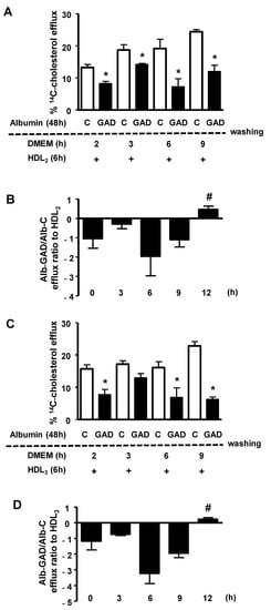 Persistence of the effect of GAD-albumin on 14C-cholesterol efflux impairment in macrophages. 14C-cholesterol and acetylated LDL overloaded BMDMs were incubated for 48 h with low-glucose DMEM containing 1 mg/mL medium of control (C-albumin) or glycolaldehyde-treated albumin (GAD-albumin). After this period, cells were washed with PBS/FAFA and immediately tested for cholesterol efflux mediated by HDL2 (panels A and B) or HDL3 (panels C and D), or after resting in DMEM/FAFA for different periods of time (0 to 12 h). Efflux experiments were performed for 6 h. In panels B and D, the efflux rate is expressed as ratio of GAD-albumin/C-albumin, considering three independent experiments. Comparisons were done by Student’s t test * p < 0.05 as compared to C-albumin (n = 3); # p < 0.05 as compared to other time periods.