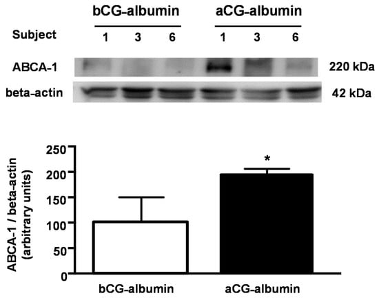 Interestingly, ABCA-1 protein levels were lower in cells treated with albumin isolated bGC as compared to aGC agreeing with the increased rate of ABCA-1 decay rate in macrophages of a different cell line exposed along time with albumin from subjects with poorly controlled T1DM as compared to albumin from control subjects.