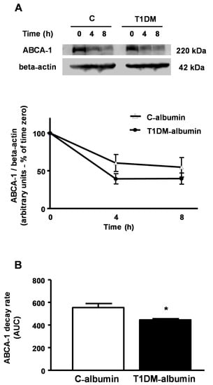 J774-macrophages were incubated over time with C and T1DM albumins (2 mg/mL) in the presence of cycloheximide (400 µg) to determine the ABCA-1 decay rate. A 20% increase in ABCA-1 decay rate was observed in macrophages treated with T1DM-albumin (Figure 7, panel A), with a lower AUC as compared to C-albumin (Figure 7, panel B). This result agrees with previous data showing that AGE-albumin reduces ABCA-1 protein levels by increasing ABCA-1 intracellular degradation, which can be reverted by the improvement of glycemic control.