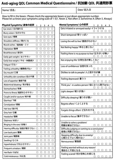 Anti-aging QOL Common Questionnaire. The questionnaire is composed of 33 questions relating to physical symptoms and 21 questions relating to mental and emotional symptoms.