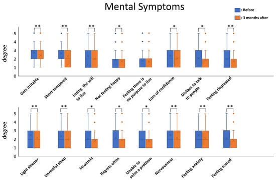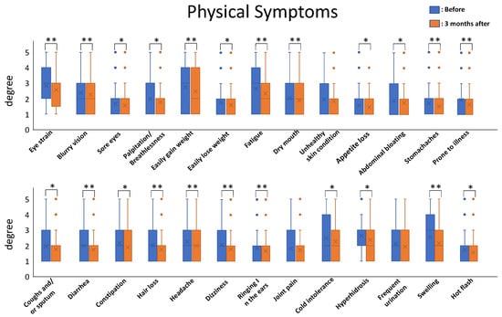 All the symptoms tended to decrease after nutritional therapy, and the mean values for 23/26 of the physical-symptom-related questions and 15/16 of the mental-symptom-related ones showed statistically significant differences from before to after three months of nutritional therapy (t-test; n = 253; * p < 0.05; ** p < 0.01) (Figure 2 and Figure 3).