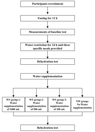 All participants were instructed to fast for 12 h. Participants were supplied with three meals, prepared by the study. They were divided into four groups randomly, which included the water supplementation groups (WS group 1, 2, 3) and the no water supplementation group (NW group). The amounts of water in WS groups 1, 2, and 3 were 1000, 500, and 200 mL, respectively. Cognitive performance and mood were measured three times. Measurements of anthropometric indexes (including height, weight, and blood pressure), blood biomarkers (including blood glucose and plasma osmolality), and urinary biomarkers (including osmolality and the specific gravity of urine) were executed at the same time.