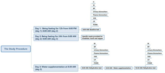 Stage 1: from 8:00 p.m. of day 1 to 8:00 a.m. of day 2. Participants were instructed to fast overnight for 12 h. However, before the protocol of the study (before 8:00 p.m. of day 1), participants were asked to maintain their fluid intakes as usual. They were also asked to sleep before 11:00 p.m. and not to urinate before getting up the next morning. At 8:00 a.m. of day 2, the baseline tests, including height, weight, blood pressure, and blood samples, were performed by the researchers, with urine samples and blood samples collected and tested. Furthermore, measurements of mood and cognitive performance, and the subjective sensation of thirst, were taken at the same time.