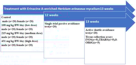 - Li, I.-C.; Chen, Y.-L.; Lee, L.-Y.; Chen, W.-P.; Tsai, Y.-T.; Chen, C.-C. Evaluation of the toxicological safety of erinacine A-enriched Hericium erinaceus in a 28-day oral feeding study in Sprague–Dawley rats. Food Chem. Toxicol. 2014, 70, 61–67. [Google Scholar] [CrossRef]