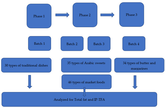 A series of samples collections were conducted over the last two years. The 2019 samples collection, conducted in November 2019, was not centrally coordinated at the capital city Beirut but instead pooled data from five separate sources from the five main governorates in Lebanon (Beirut, Beqaa, Tripoli, Saida, and Mount Lebanon). In this sample collection, we collected thirty types of traditional dishes. Traditional composite dishes are defined as dishes consumed at main meals (i.e., lunch or dinner), containing ingredients from at least three of the five main food groups and requiring preparation using culinary skills [18,19,20]. A total of 30 traditional composite dishes were identified as most frequently consumed and hence were included for analysis. The names of the food dishes were reported in the current analysis considering the most familiar name used for the dish at a national level with respect to its ingredients. The ingredients of these traditional dishes were described in Hoteit et al. [18,19,20], and the food samples were collected from five different central kitchens in the 5 governorates listed above. The central kitchens were randomly chosen based on (1) their specialties in cooking homemade dishes, (2) their popularity in the area, (3) their implications in social entrepreneurship and women empowerment (e.g., household women who cook for these central kitchens). Consequently, the food samples were classified into 5 strata, per governorate area [20]. The samples were identified according to their frequency of consumption [21,22] and selected for IP-TFAs analysis mainly for two non-conjugated fatty acids (EA and LEA). In contrast, the subsequent samples collections 2020, conducted in April, were centrally coordinated at Beirut having the broadest coverage in terms of products selected and had a sample of thirty-five types of Arabic sweets and forty-six types of market food products. The full methodology of food list identifications and food sampling is described elsewhere [18,19,20]. On the other hand, the 2021 sample collections, conducted in March, were nationally coordinated, with a coverage of 34 available types of butter and margarines purchased from all the Lebanese markets. Lot numbers were checked to ensure that each unit belonged to a different lot. The samples were stored, labeled, and analyzed before expiry dates. Samples were selected to include all types of butter and margarines in Lebanon. The analyses were carried out in duplicate for each sample. Thus, a composite sample from each type of food, according to each governorate, was prepared and analyzed. To further interpret current levels of IP-TFAs in Lebanese foods, product categories were compared with similar products found in other countries. A graphical scheme for the whole study is shown in Figure 1.