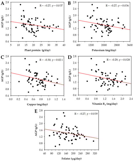 Correlations between serum concentrations of AGP and the intake of selected nutrients based on 24 h recall: plant protein (A), potassium (B), copper (C), vitamin B6 (D), and folates (E). Data are presented as arithmetic means of values obtained in post-summer and post-winter assessment.
