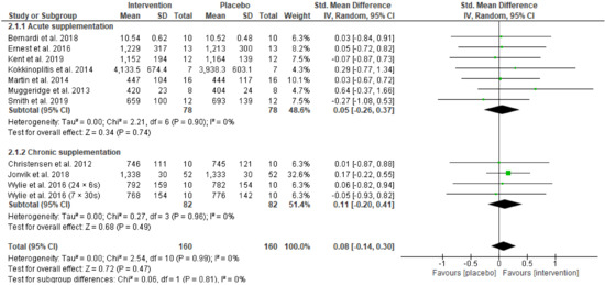 | Wylie et al. [8] | 2016 | 10 | 21.0 ± 1.0 | Team-sport players. VO2peak = 58 ± 8 | C | 8.2 mmol/day (2 × 70 mL) for 5 days. Test day 2 × 70 mL, and post-test 70 mL | Randomised, crossover, double blind | Twenty-four 6 s all-out sprints, 24 s of recovery; seven 30 s all-out sprints, 240 s of recovery, and six 60 s self-paced maximal efforts, 60 s of recovery; on days 3, 4, and 5 of supplementation, respectively. | Mean power output was significantly greater (5.4%) with BR relative to PL in the 24×6 s protocol only. 24 × 6 s protocol mean power (BR: 568 ± 136 W vs. PL: 539 ± 136 W; p < 0.05), peak power (BR: 792 ± 159 W vs. PL: 782 ± 154 W; p > 0.05); 7×30 s protocol mean power (BR: 558 ± 95 vs. PL: 562 ± 94 W; p > 0.05), peak power (BR: 768 ± 157 vs. PL: 776 ± 142 W; p > 0.05); 6×60 s protocol mean power (BR: 374 ± 57 W vs. PL: 375 ± 59 W; p > 0.05). |