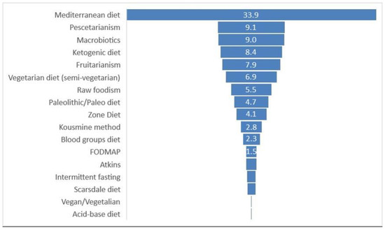 As previously mentioned, the Mediterranean diet search volume is stably high overtime, despite the fact that it is the “oldest” diet among those assessed in this work. Indeed, the Mediterranean diet was first identified by Ancel Keys during the 1960s. Moreover, this is the diet with the highest number of high-quality studies that have revealed the strong association between the Mediterranean diet and a lower risk of several conditions such as, for instance, cardiovascular disease [25], several forms of cancer [26], mental disorders [27,28] and overall mortality [29]. Although the Mediterranean diet continues to remain the most frequently searched, emerging diets have been attracting the interest of the general population. Among them, the diet that has received increasing attention is the Ketogenic diet, which is not supported by the same amount/quality of evidence as the Mediterranean diet (Supplementary Figure S4 reports the number of articles for ketogenic, Mediterranean and macrobiotic diets in PubMed by year). In fact, the increasing success of the ketogenic diet is mainly ascribable to the weight loss effect observed; however, studies have failed to prove the beneficial effect of the ketogenic diet in treating obesity or diabetes [30]. Moreover, the ketogenic diet is the last issued low-carbohydrate diet, preceded by the palaeolithic and Atkins diets. This trend was also confirmed by our results, according to which the research volume regarding the palaeolithic and Atkins diets has decreased over time.