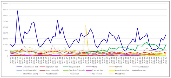 Figure 2. Wikipedia curves with reference to the number of page views for Mediterranean, vegetarian (semi-vegetarian), ketogenic, Atkins, FODMAP, acid–base, vegan, blood group, paleolithic, Scarsdale, Kousmine method, zone, intermittent fasting, pescetarianism, fruitarianism, raw foodism, and Macrobiotics diets.