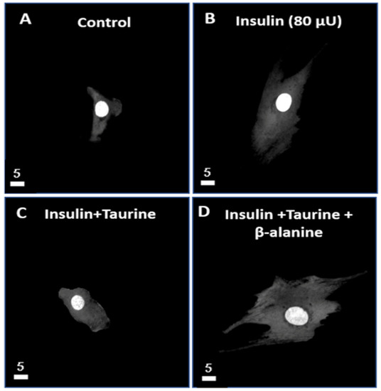 For long-term treatment, after two days in culture the cardiomyocytes were treated for 48 h in the absence and presence of different drugs: control, + insulin (80 μU/mL), + insulin (80 μU/mL), and taurine (20 mM), + insulin (80 μU/mL) + taurine (20 mmol), and β-alanine (500 μM) [4,10,23]. The concentrations of the drugs were previously used by our group [4,10,23]. In addition, the concentration of 80 μU/mL was selected as it is similar to the insulin levels observed in hyperglycemia, which is usually between 80–100 μU/mL and were used after testing several concentrations of insulin [4,24]. The concentrations of 20 mM of taurine and 500 µM of β-alanine were selected as they represented the standard concentrations used across the literature and were already published after we tested several concentrations [9,25].