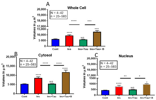 Histograms showing the effect of a 48-h treatment with insulin (80 μU/mL), insulin (80 μU/mL) with taurine (20 mM), and insulin (80 μU/mL) with taurine (20 mM) and β-alanine (500 μM) on the volume of adult rat ventricular cardiomyocytes. The results show the volume of the whole cell (A), the cytosol (B), and the nucleus (C) in the absence of treatment and in the presence of a 48-h treatment of insulin (80 μU/mL), insulin (80 μU/mL) + taurine (20 mM), and insulin (80 μU/mL) + taurine (20 mM) + β-alanine (500 μM). The values are represented as mean ± standard error of the mean. N represents the number of animals, and n represents the number of cells. **** p < 0.0001, *** p < 0.001, ** p < 0.01, and * p < 0.05 were considered significant. NS = non-signifiant. N was 42 (control), 42 (insulin), 7 (insulin + taurine), and 4 (insulin + taurine + β-alanine) for the different experiments. n was 226 (control), 158 (insulin), 33 (insulin + taurine), and 57 (insulin + taurine + β-alanine) for the different cells. Cont = control; ins = insulin; tau = taurine; and B = β-alanine. The volume of the cell is in μm3.
