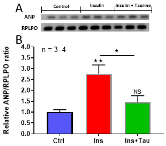 RT-PCR showing the effect of a 48-h treatment with insulin (80 μU/mL) and insulin (80 μU/mL) with taurine (20 mM) on the relative ANP/RPLPO ratio of ventricular cardiomyocytes. (A): Autoradiography showing the levels of ANP of ventricular cardiomyocytes in the absence of treatment, treated with insulin (80 μU/mL) and treated with insulin (80 μU/mL) + taurine (20 mM). (B): The statistical comparison of the relative ANP/RPLPO ratio was calculated using the densitometric measurements of the corresponding bands. The values are represented as mean ± standard error of the mean. n represents the number of wells. * p < 0.05 and ** p < 0.01. ANP = atrial natriuretic peptide; RPLPO = large ribosomal protein P0; NS = non-significant.