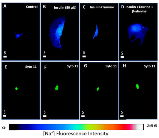 Examples of quantitative 3-D confocal images (top view) showing the distribution and fluorescence intensity of intracellular sodium in cardiomyocytes in the absence of treatment (A), in the presence of insulin (80 μU/mL) (B), in the presence of insulin (80 μU/mL) + taurine (20 mM) (C), and in the presence of insulin (80 μU/mL) + taurine (20 mM) + β-alanine (500 μM) (D). Panels (E–H) represent the Syto-11 labeled nuclei of the cells in panels (A–D). The pseudo-color bar represents Na+ fluorescence intensity ranging from 0 (absence of fluorescence) to 255 (maximum fluorescence). The white scale bar is in μM.