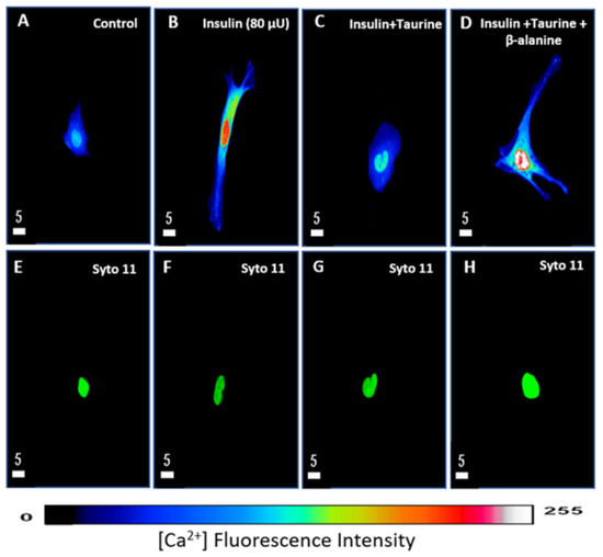 Examples of quantitative 3-D confocal images (top view) showing the distribution and fluorescence intensity of intracellular calcium levels in cardiomyocytes in the absence of treatment (A), in the presence of insulin (80 μU/mL) (B), in the presence of insulin (80 μU/mL) + taurine (20 mM) (C), and in the presence of insulin (80 μU/mL) + taurine (20 mM) + β-alanine (500 μM) (D). (E–H) represent the Syto-11-labeled nuclei of the cells in (A–D). The pseudo-color bar represents Ca2+ fluorescence intensity ranging from 0 (absence of fluorescence) to 255 (maximum fluorescence). The white scale bar is in μM.