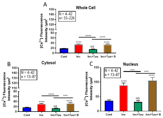 Histograms showing the effect of 48-h treatment with insulin (80 μU/mL), insulin (80 μU/mL) with taurine (20 mM), or insulin (80 μU/mL) with taurine (20 mM) and β-alanine (500 μM) on whole-cell (A), cytosolic (B), and nuclear (C) sodium levels of cardiomyocytes. The values are represented as mean ± standard error of the mean. N represents the number of animals, and n represents the number of cells. * p < 0.05, ** p < 0.01, and **** p < 0.0001. Cont = control; ins = insulin; tau = taurine, and B = β-alanine. Sodium relative concentration is expressed in μm3.
