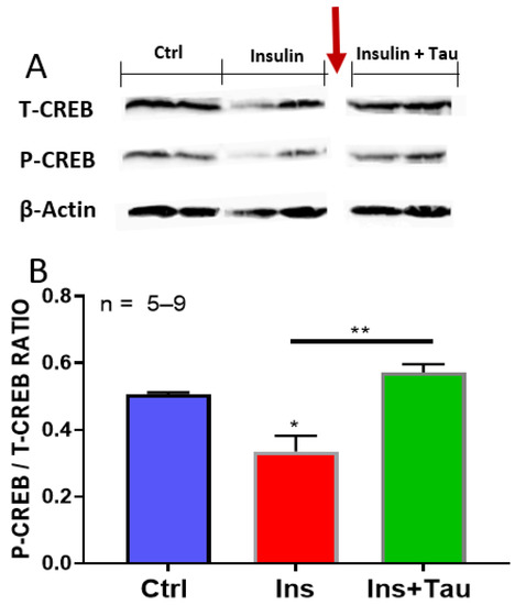 3.4. Effect of Long-Term Treatment with Insulin and Insulin + Taurine on the Ratio of pCREB/tCREB