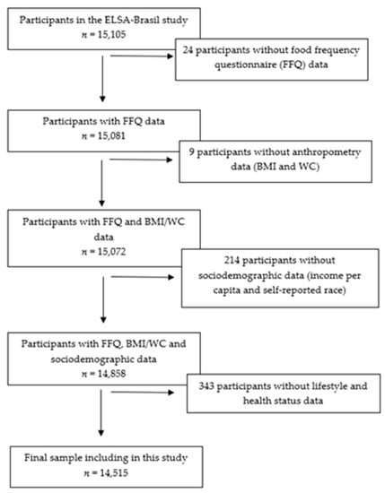 This study is a cross-sectional analysis of the baseline data from ELSA-Brasil, a multicenter and ongoing cohort study conducted in six Brazilian cities (São Paulo, Rio de Janeiro, Salvador, Porto Alegre, Belo Horizonte and Vitoria) from three major Brazilian regions (Northeast, Southeast, and South). The study design and data collection were described previously [16,17,18,19]. Briefly, ELSA-Brasil enrolled 15,105 civil servants from five universities and one research institute, with the following exclusion criteria: current or recent (4 months prior to the first interview) pregnancy, intention to quit working at the institution in the near future, severe cognitive or communication impairments, and, if retired, residence outside of a study center. Baseline data from ELSA-Brasil were collected between August 2008 and December 2010. ELSA-Brasil was approved by the research ethics committees of all the research centers. All the participants volunteered and signed an informed consent form. For the present analysis, we disregarded participants without food consumption, anthropometric, or covariates data; thus, the final sample for analysis included 14,515 individuals (Figure 1).