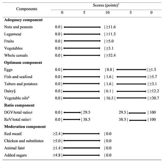 Each one of the 16 components can score proportionally between 0 and 5 or 10 points. The components in the adequacy, optimum and moderation categories can reach a maximum of 10 points, while the ratio components can score a maximum of 5 points, resulting in a total score from 0 to 150 points. More information regarding the cutoff points and scoring criteria can be obtained from Cacau et al. [12]. Figure 2 presents the PHDI components, cut-off points and scoring criteria. Table S1 shows examples of the foods and ingredients included in the PHDI components.