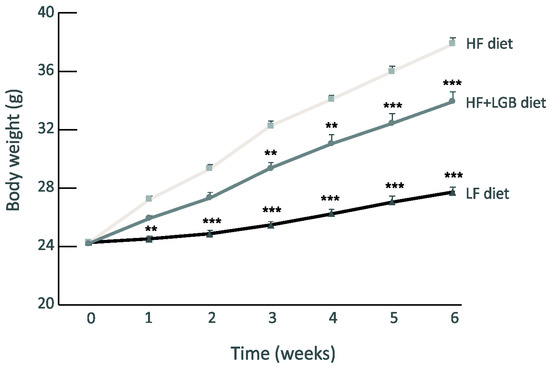 In the high-fat (HF) diet group, the weight of mice increased consistently during the study when compared with the mice in the low-fat (LF) diet group. Notably, lingonberry supplementation (HF + LGB group) significantly prevented the high-fat diet-induced weight gain (p < 0.001 between the HF and HF + LGB groups). After 6 weeks, the average weight was 27.7 ± 0.3 g in the LF diet group, 37.9 ± 0.4 g in the HF group and 34.0 ± 0.7 g in the HF + LGB group. The weight gain in the three groups is presented in Figure 1.