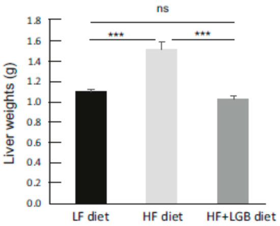 Liver weights of the mice at the end of the study. Animals received low-fat diet (LF diet, black column), high-fat diet (HF diet, light grey column) or high-fat diet supplemented with lingonberry (HF + LGB diet, grey column). The results are expressed as grams (g). Values represent mean + SEM, n = 9 mice per group. One-way ANOVA with Bonferroni post-test was used in the statistical analysis, *** = p < 0.001 and ns = not significant.