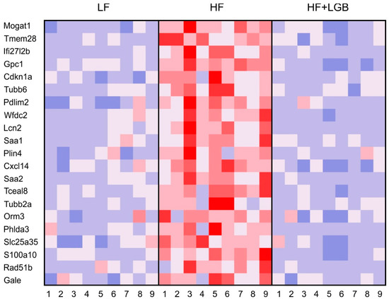 A heatmap of the genes upregulated by the HF diet (with an average fold change > 1.5 as compared with LF diet group) and whose increase was prevented by the HF + LGB diet (with an average fold change < −1.5 as compared with HF diet group). Gene expression levels are DESeq2-normalized and row-scaled; red color: higher expression; blue color: lower expression. N = 9 mice per group as indicated with the numbers on the horizontal axis.