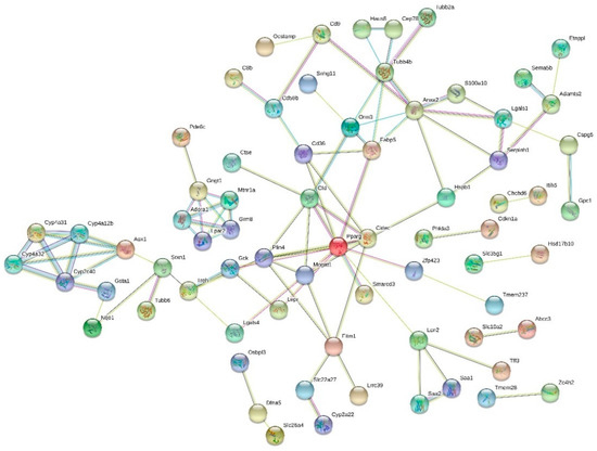 PPARγ has two isoforms, PPARγ1 and PPARγ2, encoded from a single gene using two separate promoters and alternative splicing [54]. Mouse PPARγ2 contains 30 additional amino acids at the N-terminal side. While the two PPARγ isoforms share the same DNA binding specificity, the PPARγ2 seems to have 5–10 -fold greater transcription activity than PPARγ1. Based on literature, PPARγ2 is considered the principal isoform in adipose tissue and in obese liver [54]; a greater increase was also found in the hepatic expression of Pparg2 than Pparg1 induced by the high-fat diet (Table S7). The functional significance of the increased Pparg expression by the high-fat diet in the current study is supported by enhanced expression of PPARγ target genes, such as monoacylglycerol O-acyltransferase 1 (Mogat1, FC 2.51, for synthesis of diacylglycerol), cluster of differentiation 36 (CD36, FC 1.73 for fatty acid uptake) and cell death-inducing DFFA-like effector c (Cidec, FC 1.72, for lipid droplet formation). Many of these were also located at central positions in the STRING analysis. Interestingly, PPARγ agonists (thiazolidinediones, TZDs) belong to the very few drugs that have shown promise in the treatment of NAFLD. They are insulin sensitizing drugs used in the treatment of diabetes, and their potential benefits in NAFLD lay on their effects on adipose and hepatic tissues [52,53,54].
