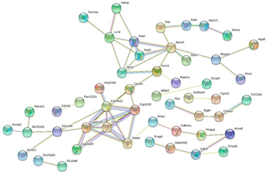 Interactions between the protein products of the most strongly up- and downregulated (FC > 1.5 or < −1.5) genes were studied using the STRING tool. Notably strong and interesting interactions between HF vs. LF diet groups were the group of genes related to lipid metabolism/liver steatosis: peroxisome proliferator activated receptor gamma (Pparg), complement factor D (Cfd, also known as adipsin), monoacylglycerol O-acyltransferase 1 (Mogat1), cell death-inducing DFFA-like effector c (Cidec) and fatty acid binding protein 5 (Fabp5), the network of four cytochrome P450 enzymes (Cyp2c40, Cyp4a12b, Cyp4a31 and Cyp4a32), and the network around annexin A2 (Anxa2) (Figure 4).