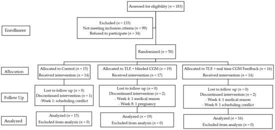 CGM data were downloaded weekly by the study team. CGM data were evaluated continuously over the study period. This data was utilized to compute the following measures: mean, maximum, and minimum glucose levels; standard deviation of glucose; mean amplitude of glycemic excursion; and overall percent of total time spent in euglycemic range (percent time in range = 70–180 mg/dL). All CGM data were housed in Clarity (Dexcom and Dexcom CLARITY are registered trademarks of Dexcom, Inc., San Diego, CA, USA) and the study team had weekly access to assess all glycemic excursions that occurred during the self-reported fasting periods [,,,]. For those in the TLE + real-time CGM feedback group, every time they viewed their CGM data in the app, the event was captured, and time stamped in the Clarity system.
