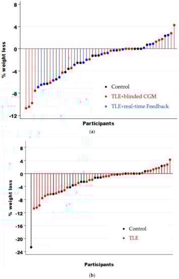 Percent weight loss at week 12 compared to baseline by individual participants across: (a) all three intervention arms and (b) TLE groups (TLE + blinded CGM and TLE + real-time CGM) compared to control.