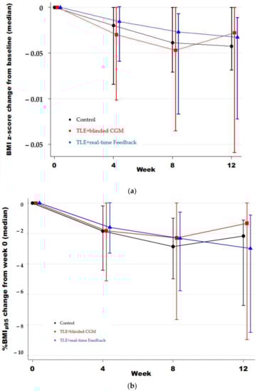 There was great heterogeneity in weight loss across participants. Overall, 68% of adolescents lost weight during the intervention period (Figure 2). Post-intervention, 26% of the TLE + blinded CGM group lost ≥5% of their baseline weight vs. 31% in the TLE + real-time CGM feedback and 13% in the control group (no between-group difference p = 0.5). Consistent with intention-to-treat analysis, across the study period, there was a significant decrease in median weight loss (kg), %BMIp95, and zBMI across all three groups, with no significant difference in weight loss between groups from the mixed-effect generalized linear models (Table 3 and Table 4, and Figure 3). Sensitivity analysis was conducted to exclude one participant in the control group that lost >15% of their total body weight and the results remained the same. In addition, given that very few adolescents in the TLE+ real-time CGM feedback group looked at their real-time data, we completed a post hoc analysis combining both TLE groups compared to the control and the results remained the same (all p > 0.05).