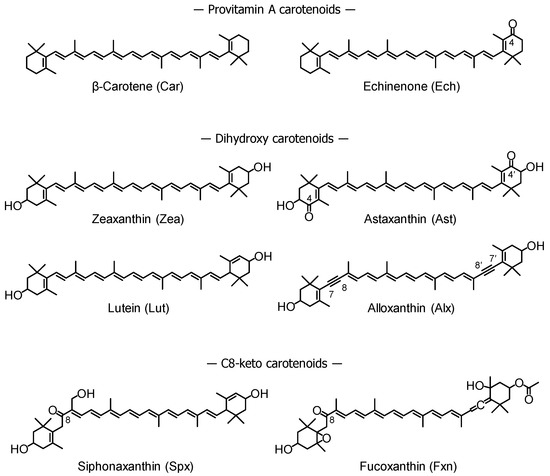 Manabe, Y.; Tomonaga, N.; Maoka, T.; Sugawara, T. Multivariate Analysis Reveals That Unsubstituted β-Ring and C8-Keto Structures Are Important Factors for Anti-Inflammatory Activity of Carotenoids. Nutrients 2021, 13, 3699. https://doi.org/10.3390/nu13113699