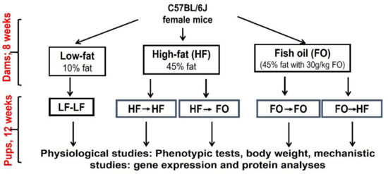 - Albert, B.B.; Vickers, M.H.; Gray, C.; Reynolds, C.M.; Segovia, S.A.; Derraik, J.G.B.; Garg, M.L.; Cameron-Smith, D.; Hofman, P.L.; Cutfield, W.S. Fish oil supplementation to rats fed high-fat diet during pregnancy prevents development of impaired insulin sensitivity in male adult offspring. Sci. Rep. 2017, 7, 5595. [Google Scholar] [CrossRef] [PubMed]