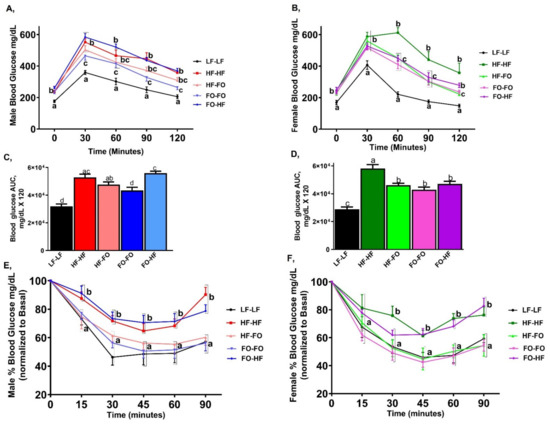 We evaluated glucose tolerance by GTT. HF feeding significantly increased basal glucose levels in male and female offspring compared to LF-LF group (Figure 3A,B). HF-HF & HF-FO male groups had similar glucose clearance. FO-HF male offspring had higher glucose intolerance compared to FO-FO group, indicated by a higher area under the curve (AUC) as shown in Figure 3C. Furthermore, FO-FO supplementation lowered glucose intolerance in male and female offspring compared to HF-HF offspring (Figure 3B,D). For AUC, no sex differences were observed, although interaction between diet and sex was found. For ITT, FO-FO and HF-FO groups showed improved insulin sensitivity similar to LF-LF groups for both male and female mice, and most importantly FO-FO and HF-FO and LF-LF groups were clearly separated from HF fed groups (HF-HF and FO-HF) from 30-min time point onwards (Figure 3E,F).