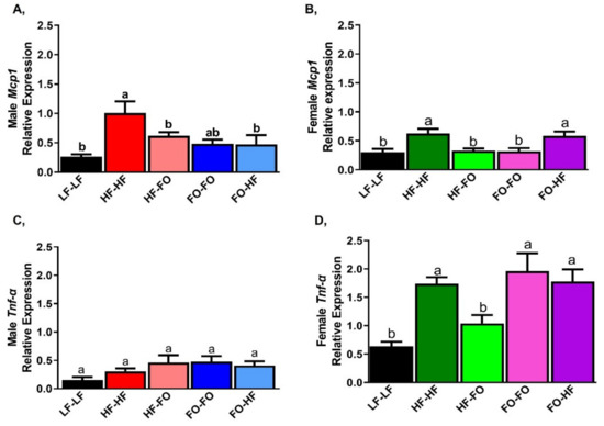 Interestingly, FO or HF supplementation increased Tnf-α mRNA levels in females compared to male offspring based on 2-way ANOVA (Table 1).