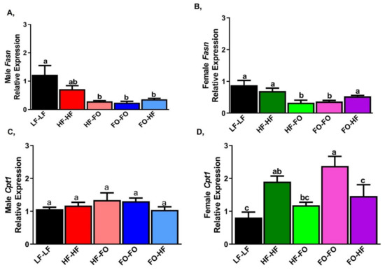 In the liver, there were no differences in mRNA levels of Fasn between HF-HF and LF-LF fed male and female offspring. HF or FO supplemented male groups had comparable mRNA levels of Fasn (Figure 9A,B). HF-FO female offspring had lower Fasn mRNA levels compared to HF-HF group (Figure 9B). FO-HF female offspring had increased Fasn mRNA levels compared to FO-FO groups (Figure 9B). HF fed female offspring groups and LF-LF had significantly lower mRNA levels of Fasn than those of the respective male offspring groups. No interaction was found between diet and sex for Fasn. mRNA levels of Acaca were measured and data were similar to Fasn mRNA levels (Figure S3A,B).