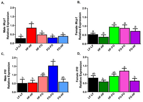 As observed in adipose tissue, HF feeding increased Mcp1 mRNA levels in male offspring compared to LF-LF (Figure 10A). FO supplementation during gestation or development lowered Mcp1 mRNA levels in male offspring. In females, HF and LF-LF fed offspring had no difference in Mcp1 mRNA levels (Figure 10B). Interestingly, Mcp1 was trending higher in groups that were supplemented with FO compared to HF-HF offspring in females (Figure 10B). Based on 2-way ANOVA, female HF-FO and FO-HF groups had higher Mcp1 mRNA levels compared to male offspring mice. Further no sex differences were found for Il6 gene levels. Interleukin 10 (Il10) mRNA levels were not different between LF-LF and HF fed male and female offspring (Figure 10C,D). Further, HF-HF & HF-FO male and female offspring had comparable Il10 mRNA levels. Male FO-FO & FO-HF offspring had no difference in Il10 mRNA levels, but FO-FO female offspring had higher Il10 mRNA levels compared to HF-HF (Figure 10C,D).