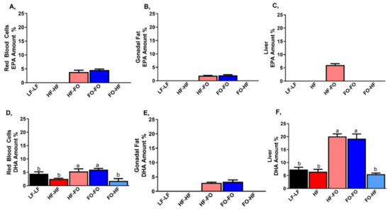 Lastly, we also confirmed that the EPA and DHA in the diet reached tissues (gonadal fat, liver, and blood) in male offspring groups. EPA was detectable only in groups that were supplemented with FO as shown in Figure 11A–C. In the red blood cells, EPA was 4% of the total fatty acids, while lower amounts were detected in adipose tissue at 2% of the total fatty acids. Similarly, higher DHA amount was detectable in groups supplemented with FO, with the highest in liver, followed by blood and adipose as shown in Figure 11D–F. Saturated fatty acid content was also measured but was unaltered between the diets in red blood cells, gonadal fat and liver, as shown in Tables S3–S5.
