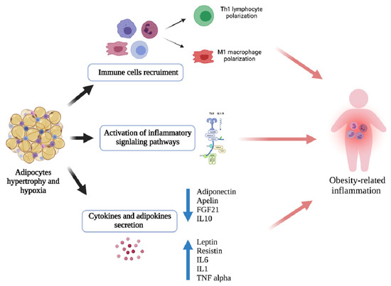 Adipocyte hypertrophy and local hypoxia play major roles in directing this diversification due to adipocyte expansion, which upregulates the secretion of inflammation-related adipokines [90]. In response to adipocyte death, proinflammatory M1 macrophages surround dead and dying cells and remove debris from the damaged area. Nowadays, obesity-related meta-inflammation is thought to be caused by the infiltration of adipose tissue by M1 macrophages, along with their altered function and anatomical localization.