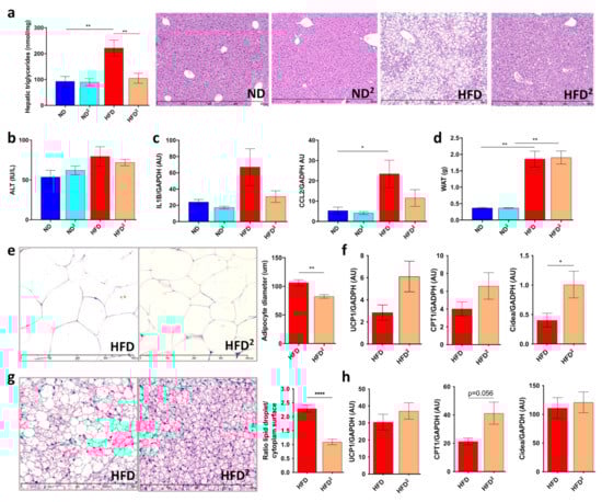 Mice were fed an HFD or HFD2 for 16 weeks. Pectin had no effect on dietary intake or weight gain (Figure S1a,b). Mice fed an ND2 showed no differences in the liver relative to mice fed an ND (Figure 1 and Figure S1). Pectin prevented the development of steatosis in HFD-fed mice, as shown by histological analysis and TG quantification (Figure 1a), leading to a decrease in the liver/body weight ratio (Figure S1c), without improvement in ALT (Figure 1b). In addition, we found that mice fed an HFD2 showed a decrease in inflammatory gene expression (Figure 1b,c), but this did not reach statistical significance. At the daily dose of pectin used, there was neither improvement in glucose sensitivity nor plasma post-prandial lipids, regardless of the diet (Figure S1d,e). Consistent with the absence of weight loss in HFD2-fed mice, there was no change in the weight of epididymal WAT (Figure 1d and Figure S1f). However, histological analysis showed a significant decrease in the semi-quantified adipocyte diameter in HFD2-fed mice (Figure 1e). This lower size of adipocytes was associated with an increase in Cidea mRNA levels, without a significant increase in those of UCP1 or CPT1 (Figure 1f), markers of the BAT function, suggesting a browning of WAT [,]. Of note, such morphological changes in WAT were also observed in ND2-fed mice relative to ND-fed mice (Figure S1g). Histological analysis of BAT showed the lowering of lipid droplet size in HFD2-fed mice (Figure 1g) which was quantified by calculating the lipid droplet surface compared to the surface of cytoplasm. Nevertheless, there was no significant increase in UCP1, CPT1, or Cidea mRNA levels (Figure 1h).