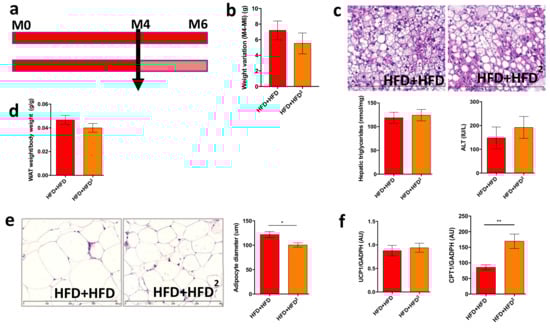 Pectin supplementation in HFD mice induces WAT browning but is not sufficient to improve liver steatosis. Mice were fed an HFD for 16 weeks and received pectin supplementation in the HFD (2%) from week 16 to week 24 as a curative treatment (HFD + HFD2) versus mice who did not receive pectin (HFD + HFD): (a) design of the mouse experiment. (b) Change in body weight between 16 (M4) and 24 weeks (M6). (c) Histological images of a liver tissue section stained with hematoxylin-eosin (scale 400 μm), hepatic triglyceride content, and plasma ALT. (d) White adipose tissue (WAT) weight/body weight ratio. (e) WAT section stained with hematoxylin-eosin (scale 400 μm) and histomorphometric analysis of adipocyte diameter (μm). (f) Quantification of mRNA expression by RT-qPCR of UCP1 and CPT1 in WAT. Data represent the mean ± SEM of eight mice. * p < 0.05, ** p < 0.01.