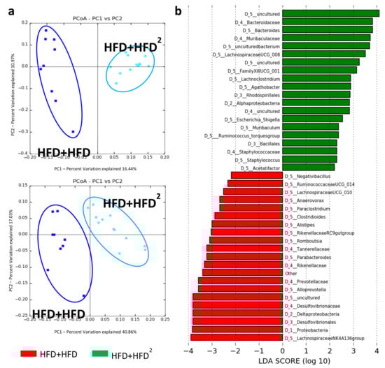 Modification of the IM of HFD mice following pectin supplementation. Mice were fed an HFD for 16 weeks and received pectin supplementation (2%) from week 16 to week 24 as curative treatment (HFD+HFD2) versus mice not receiving pectin (HFD + HFD): (a) unweighted (left, p = 0.02) and weighted (right, p = 0.01) Unifrac distances showing differences in IM composition and relative OTU abundance between HFD + HFD (dark blue) and HFD + HFD2 (light blue) mice. (b) LDA Effect Size (LEfSe) for the taxa enriched in HFD + HFD (red) or HFD + HFD2 (green) mice. Only taxa with a LDA score >2 and p < 0.05, determined by the Wilcoxon signed rank test, are shown. Data represent analysis of the IM of 9 or 12 mice.
