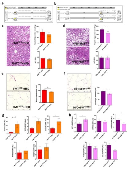 We investigated whether the IM modifications induced by pectin played a major role in the improvement of liver steatosis by collecting the IM of mice fed an HFD supplemented or not with pectin and performing fecal microbiota transfer (FMT). We transplanted the IM from HFD obese mice (FMTHFD + HFD) or HFD obese mice treated with pectin (FMTHFD2 + HFD) to control mice as a preventive treatment before the induction of obesity (Figure 5a). Similarly, we transplanted the IM, after the induction of obesity as a curative treatment, identified as HFD+ FMTHFD or HFD + FMTHFD2 (Figure 5b). As observed in HFD-fed mice, with or without pectin, there were no changes in dietary intake, weight gain, WAT accumulation, ALT levels, glucose sensitivity, or brown adipocyte morphogenesis for either preventive or curative FMT (Figure S4a–h). There were also no significant changes in terms of steatosis for FMT as a preventive treatment (Figure 5c). Conversely, curative FMT decreased steatosis, as shown by hepatic TG content and histological analysis (Figure 5d). There was no effect on liver inflammation.