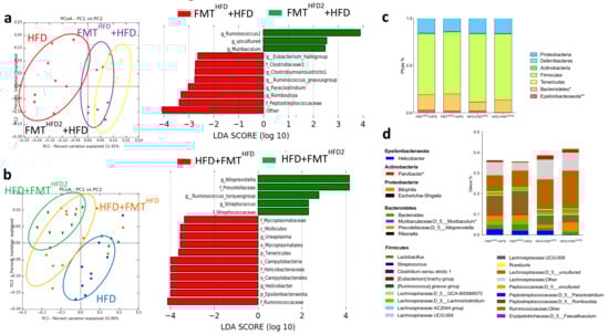 Curative and preventive FMT induce modifications of IM composition. Mice received a preventive FMT before 16 weeks of HFD from donor mice fed an HFD (FMTHFD + HFD) or donor mice fed an HFD2 (FMTHFD2+ HFD). Obese mice received a curative FMT before eight supplementary weeks of HFD from donor mice fed an HFD (HFD + FMTHFD) or donor mice fed an HFD2 (HFD + FMTHFD2): (a) unweighted Unifrac distances showing differences in IM composition between the groups: red = HFD (4 months of diet), yellow = FMTHFD2 + HFD, purple = FMTHFD + HFD (p = 0.01) (left panel), and LDA effect size (LEfSe) for the taxa enriched in FMTHFD + HFD (red) or FMTHFD2 + HFD (green) mice (right panel). Only taxa with a LDA score >2 and p < 0.05, determined by the Wilcoxon signed rank test, are shown. (b) Unweighted Unifrac distances showing differences in IM composition between the groups: blue = HFD (6 months of diet), green = HFD + FMTHFD2, orange = HFD + FMTHFD; (p = 0.08) (left panel) and LDA Effect Size (LEfSe) for the taxa enriched in HFD + FMTHFD (red) or HFD + FMTHFD2 (green) mice (right panel). Only taxa with a LDA score >2 and p < 0.05, determined by the Wilcoxon signed rank test, are shown. (c) Relative abundance of bacteria at the phyla and (d) genus level. Data represent the mean ± SEM of 9 or 12 mice. * p < 0.05, ** p < 0.01.