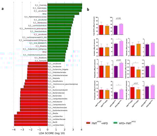 Curative and preventive FMT induce modifications of the IM and the proportion of SCFAs in cecal content. Mice received a preventive FMT before 16 weeks of HFD from donor mice fed an HFD (FMTHFD + HFD) or donor mice fed an HFD2 (FMTHFD2 + HFD). Obese mice received a curative FMT before eight supplementary weeks of HFD from donor mice fed an HFD (HFD + FMTHFD) or donor mice fed an HFD2 (HFD + FMTHFD2): (a) LDA effect size (LEfSe) for the taxa enriched in mice receiving the IM of pectin-treated mice by preventive FMTHFD2 + HFD (red) or curative HFD + FMTHFD2 (green) treatment. Only taxa with a LDA score > 2 and p < 0.05, determined by the Wilcoxon signed rank test, are shown. (b) Cecal SCFA content induced by preventive and curative FMT (μM/mg of cecal content). Data represent the mean ± SEM of 9 or 12 mice. * p < 0.05.
