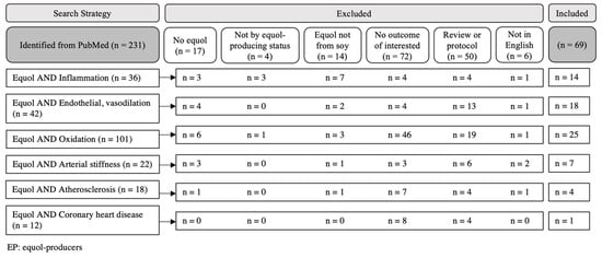 The PubMed database was searched from inception through to 28 July 2021 by two investigators (X.Z. and C.V.). Discrepancies were adjudicated with another investigator (A.S.). The MeSH terms used for the search were: equol, inflammation, oxidation, endothelial function, vasodilation, atherosclerosis, arterial stiffness, and CHD. We focused on these terms rather than the traditional CHD risk factors because the meta-analyses of human randomized controlled trials (RCTs) showed that ISFs had very small effects, if any, on the traditional cardiovascular risk factors [,]. A two-stage screening process consisting of a title-and-abstract scan and a full-text review was used to determine the eligibility of the articles. The exclusion criteria were: 1. Studies where equol was not reported; 2. human studies that were conducted among equol producers only, instead of between equol producers and non-producers, thus having a lack of contrast of the amount of equol; 3. studies where the equol was derived from plants other than soy, or the source of equol was unknown; 4. studies where the outcomes of the participants were not related to inflammation, oxidation, endothelial function, arterial stiffness, atherosclerosis, or CHD; 5. review articles or proposals; 6. studies that were published in a language other than English.