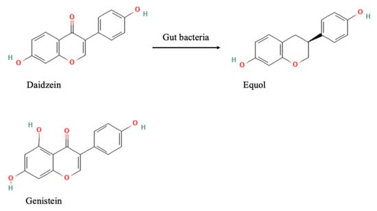 Equol is a compound that can exist as two isomers, S-equol and R-equol. However, only S-equol is produced in humans and animals. Thus, in this article, we use the term equol to denote S-equol only. Equol is the bioactive metabolite that is metabolized by intestinal bacteria from daidzein (Figure 2), and it has been suggested that it contributes to the health benefits of ISFs [,,,,]. There is interindividual variation in the ability to produce equol [,]. Although the majority of animals produce equol, 30–70% of the adult human population can produce equol following soy challenge [], and this capacity is due to the presence of specific gut microflora []. Some of the identified equol-producing bacteria are Adlercreutzia equolifaciens, Asaccharobacter celatus, Enterorhabdus mucosicola, Slackia isoflavoniconvertens, and Slackia equolifaciens [,,,]. The bacterial biosynthesis of equol from daidzein proceeds via a series of reduction reactions catalyzed by several reductases, such as nicotinamide adenine dinucleotide phosphate reductase, dihydrodaidzein reductase, and tetrahydrodaidzein reductase [,,]. If an individual’s ability to produce equol is reported to be stable over 1 to 3 years [], they can be classified as either “equol producers” or “non-producers”.
